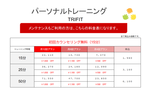 トリアス鍼灸接骨院もしくは、トリアスプラスでのメンテナンスを一緒にご利用されると、お得にトレーニングが受けられます。